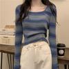 Women's Short and Unique Striped Long Sleeve T-shirt Knitted Base Top Slimming Blouse with Design Sense