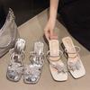 Summer New Rhinestone Bow Sandals Women's Outside Square Toe Open Toe Non-slip Wear-resistant Crystal Heels