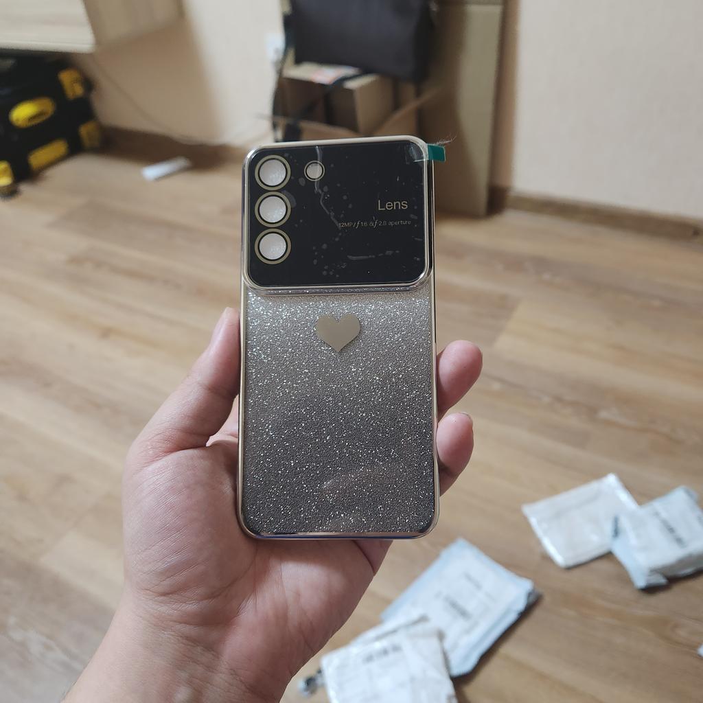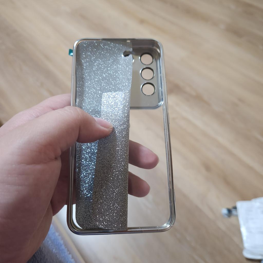 The case is silicone and transparent, when ordering, please note that the shiny background is just a film that is not fixed in any way