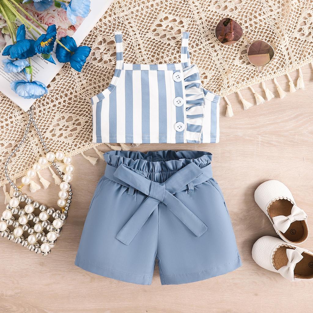 Girls' Casual Set Summer Children's Blue and White Striped Strappy Shorts