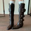 Cowhide version~ Brown boots Femininity pointed V-mouth thin belt buckle but knee high thick heel knight boots