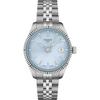 The Tissot PR 100 Quartz Light Blue Dial Ladies Watch T1019101135100 features a stainless steel case with a matching stainless steel bracelet. The fixed stainless steel bezel frames a light blue dial, adorned with luminous silver-tone hands and index hour markers. Minute markers are clearly visible around the outer rim, ensuring accurate timekeeping. This analog watch houses an ETA caliber F05.412 quartz movement, protected by a scratch-resistant sapphire crystal. The pull/push crown allows for easy adjustments, and the solid case back provides durability. With a round case shape and dimensions of 36 mm in size and 9 mm in thickness, it is designed for both elegance and comfort. The watch is water-resistant up to 100 meters (330 feet), making it suitable for casual wear as well as active lifestyles. Additionally, the date display at the 6 o'clock position adds a practical feature to this stylish piece.