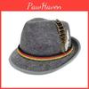 This stage prop hat features a durable fabric construction with precise sewing, crafted from high-quality cloth materials. It measures a standard one-size-fits-all design and is available in deep gray, black, emerald green, navy, light gray, tan, and brown, accented with a red feather detail.